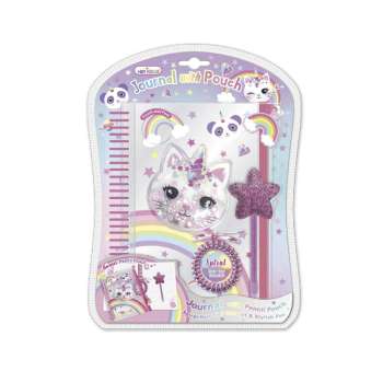 Početna stranica rokovnika je sjajna pernica sa mačkicom ispunjenom svetlucavim konfetama i priveskom u obliku duge.